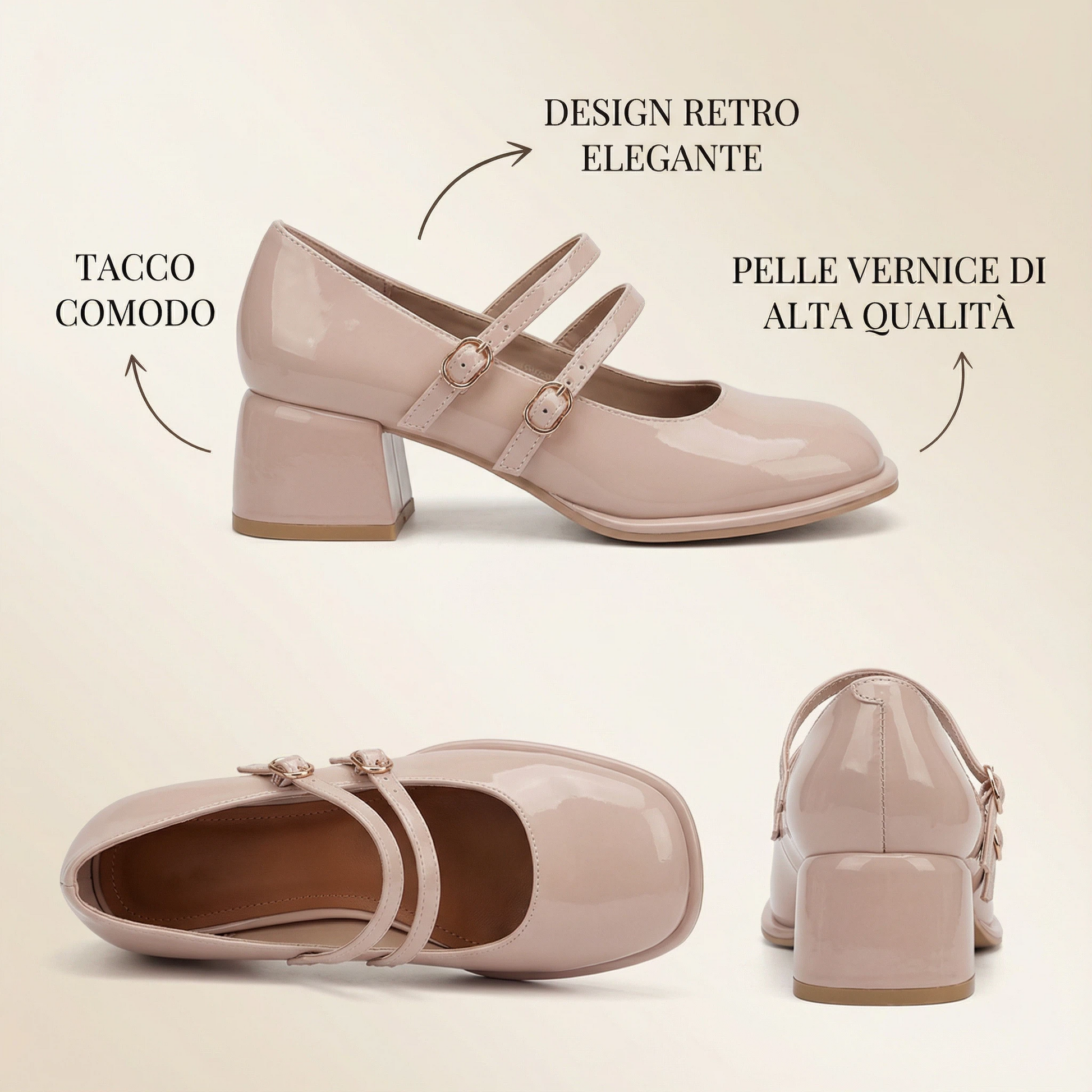 Décolleté Mary Jane da donna in vernice nude con tacco medio comodo